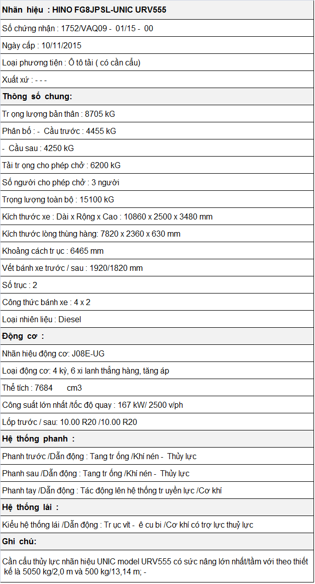 * Thông số kỹ thuật xe tải Hino 8 tấn FG8JPSL gắn cẩu Unic 5 tấn 5 đốt URV555: