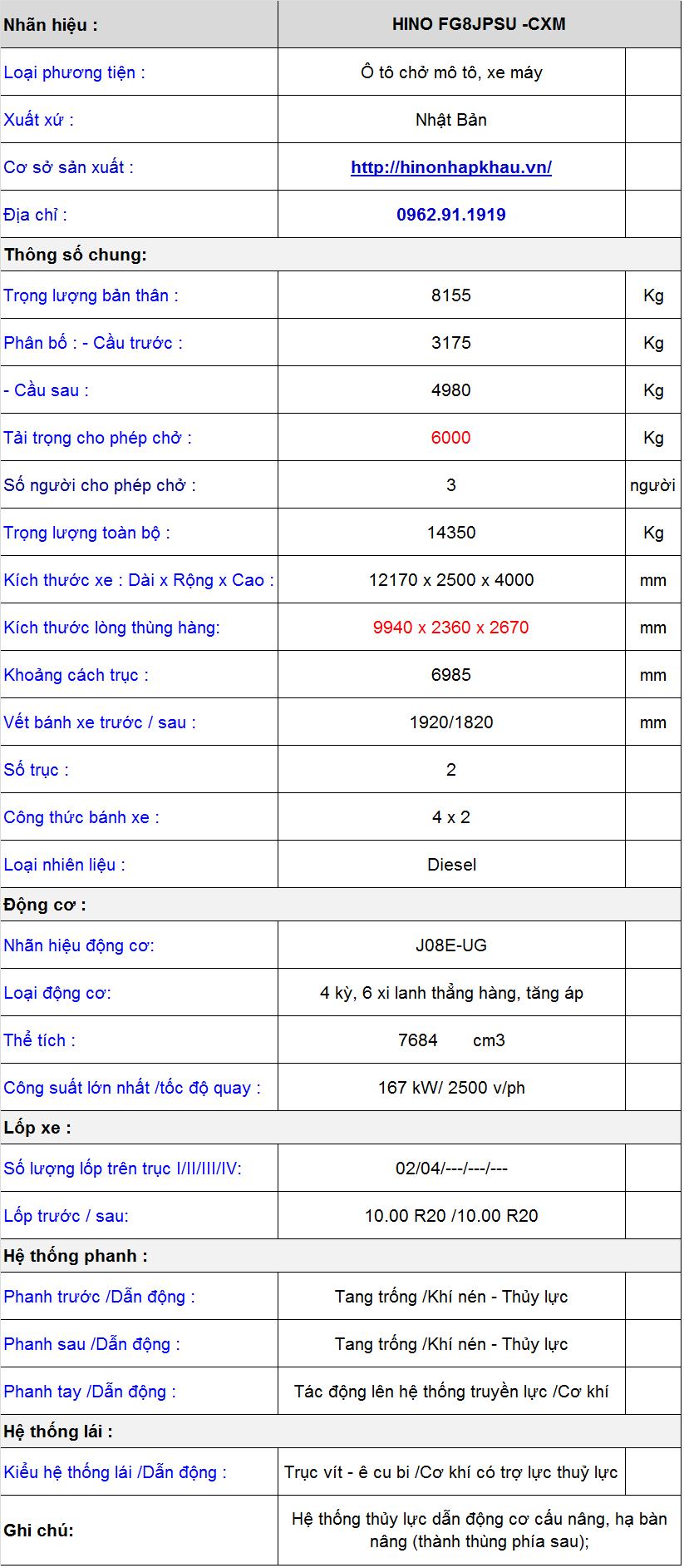 * THÔNG SỐ KỸ THUẬT XE HINO BỬNG NÂNG 2 TẦNG CHỞ XE MÁY THÙNG 10M:
