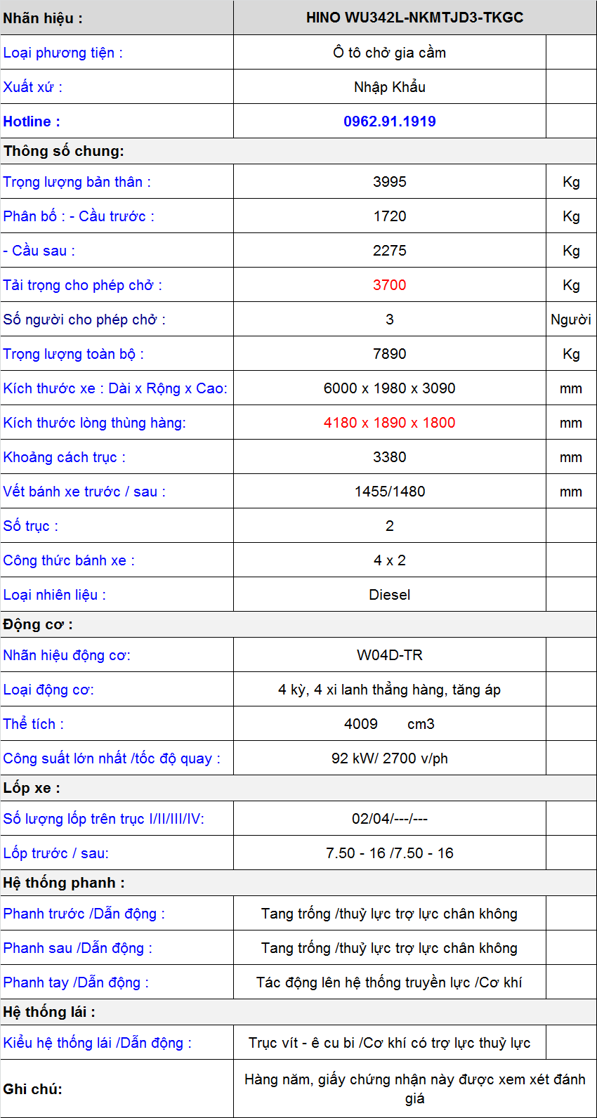 * THÔNG SỐ KỸ THUẬT XE TẢI CHỞ GIA CẦM HINO WU342L CHỞ GÀ VỊT:
