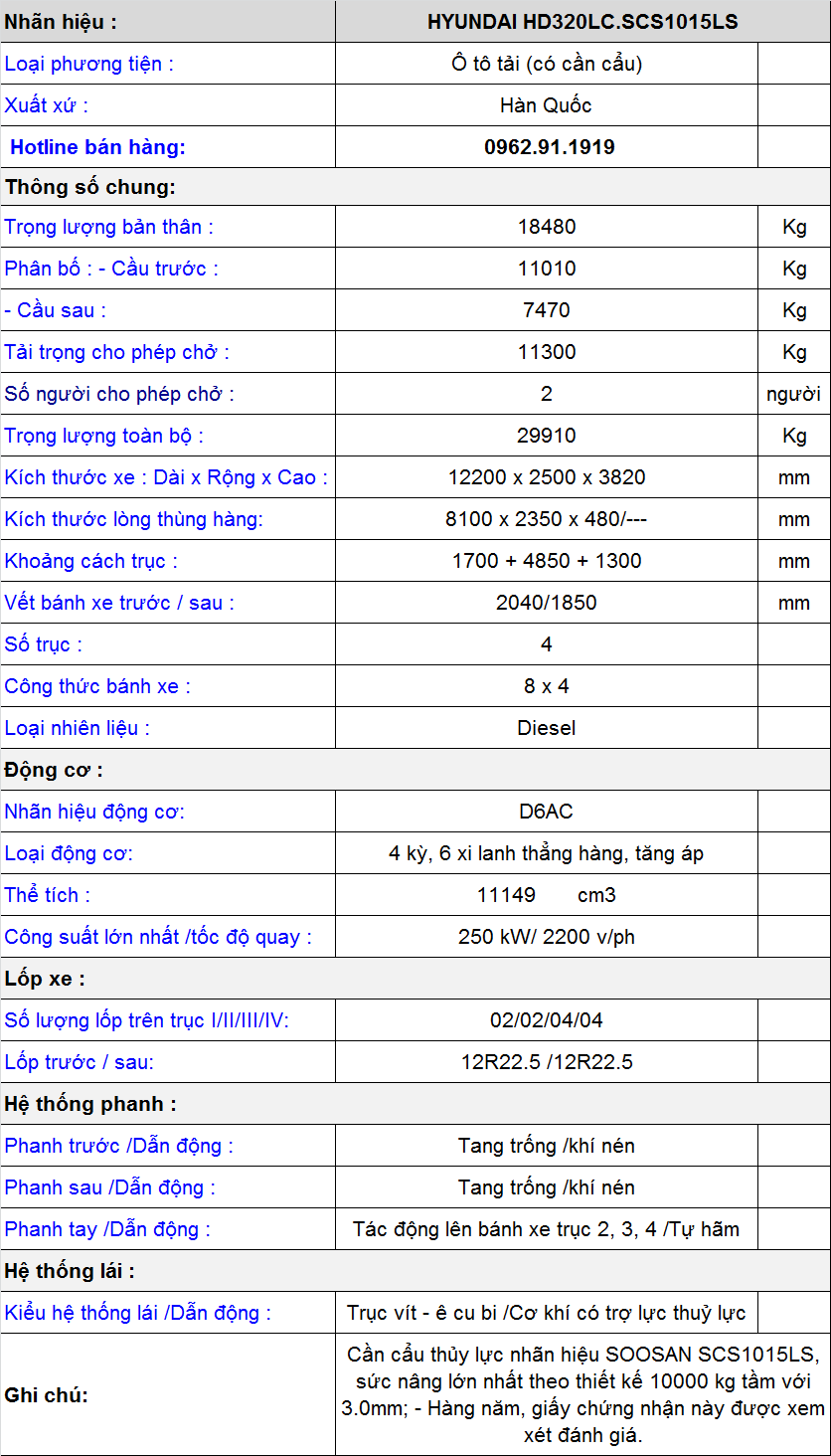 * Thông số kỹ thuật xe Hyundai HD320 sau khi gắn cẩu Soosan 10 tấn SCS1015: