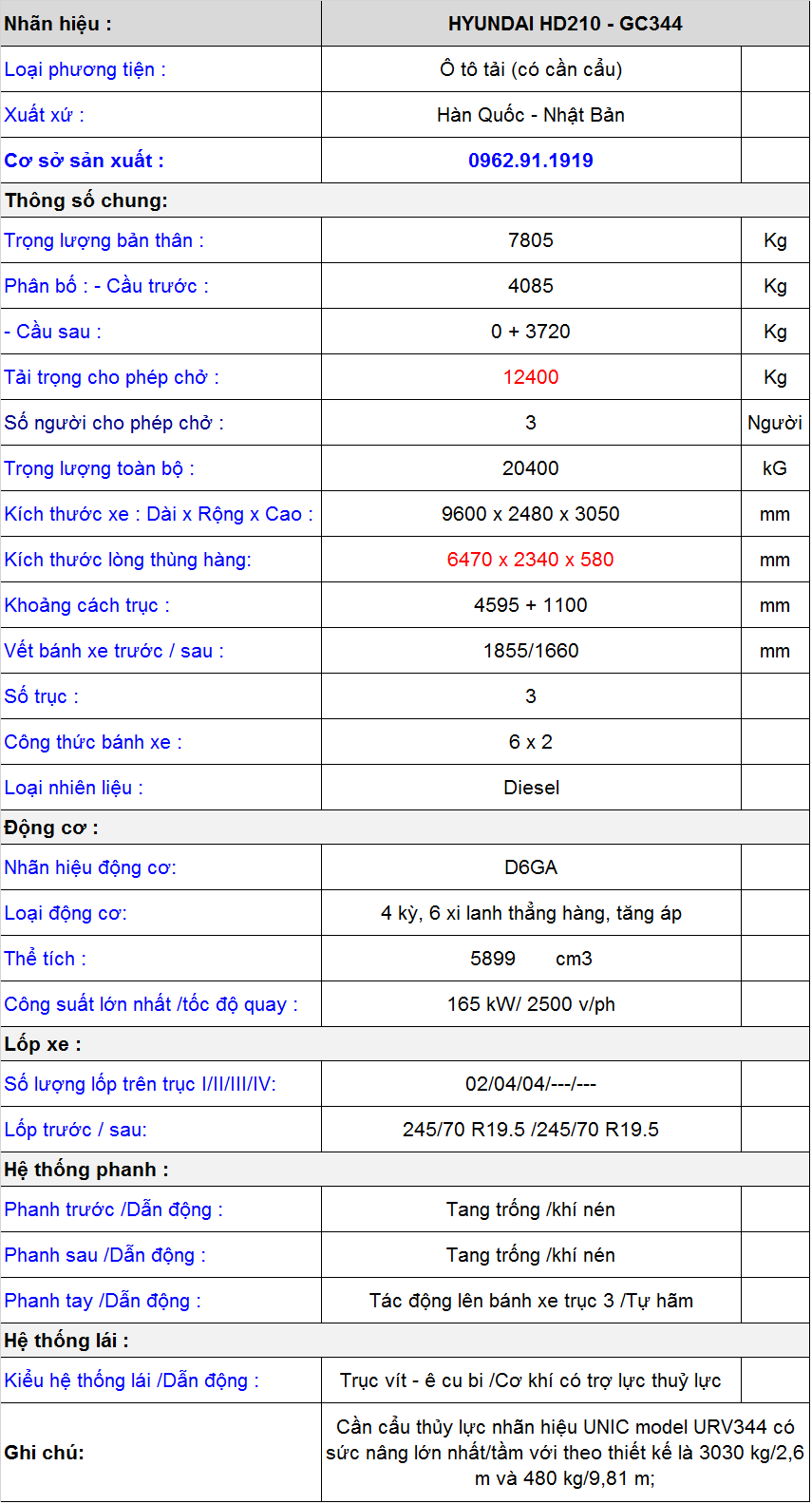 * Thông số kỹ thuật xe tải Hyundai HD210 gắn cẩu Unic URV344: