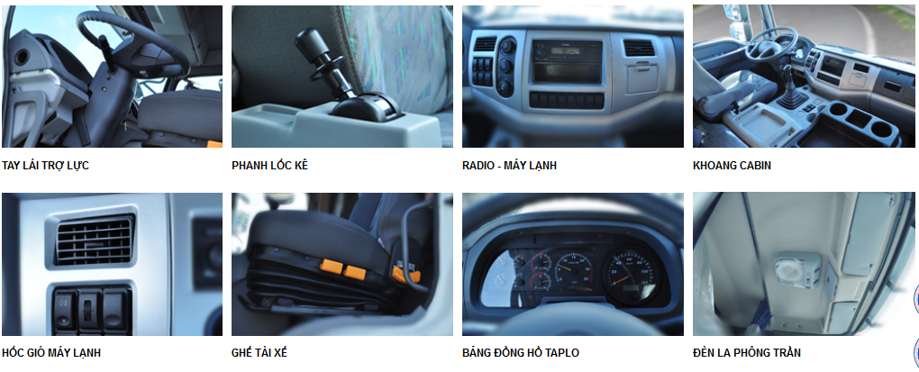 - Nội thất xe được thiết kế sang trọng, không gian cabin rộng thoáng được trang bị giường nằm phía sau rất thuận tiện cho các chuyến đi đường dài. Đồng hồ taplo thiết kế khoa học, hiển thị đa thông tin dễ quan sát khi vận hành. Vô lăng thiết kế ấn tượng, tay lái gật gù có trợ lực điều khiển lên xuống, giúp lái xe thao tác dễ dàng và thoải mái. Hệ thống âm thanh được trang bị trên xe với radio, cổng usb, hệ thống điều hòa, mồi thuốc… mang lại sự tiện nghi và thoải mái khi vận hành. Ghế hơi điều chỉnh tự động, chống sốc, đem lại sự êm ái khi di chuyển. La phông có màu xắc hài hòa tạo cảm giá thoải mái dễ chịu khi bước lên xe. Hai tấm che nắng ngăn ánh sáng mặt trời rọi và mắt người lái, Hộc đựng đồ có kích thước lớn giúp lái xe thuận tiện trọng việc bảo quản hồ sơ giấy tờ.
