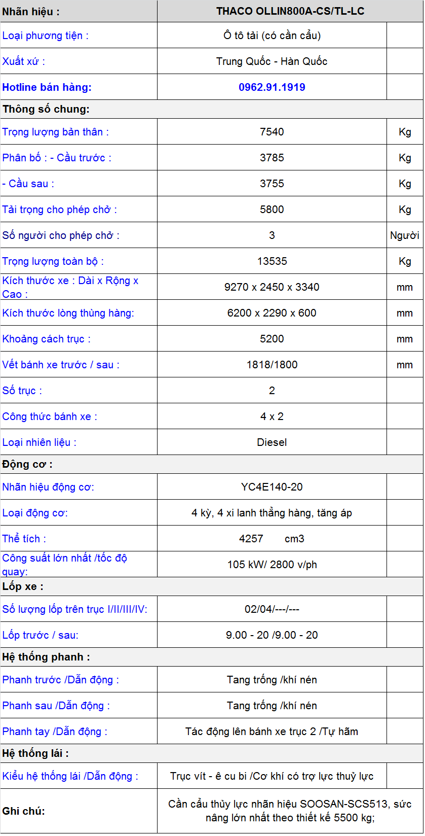 * Thông số kỹ thuật xe tải cẩu 5 tấn Ollin 800A: