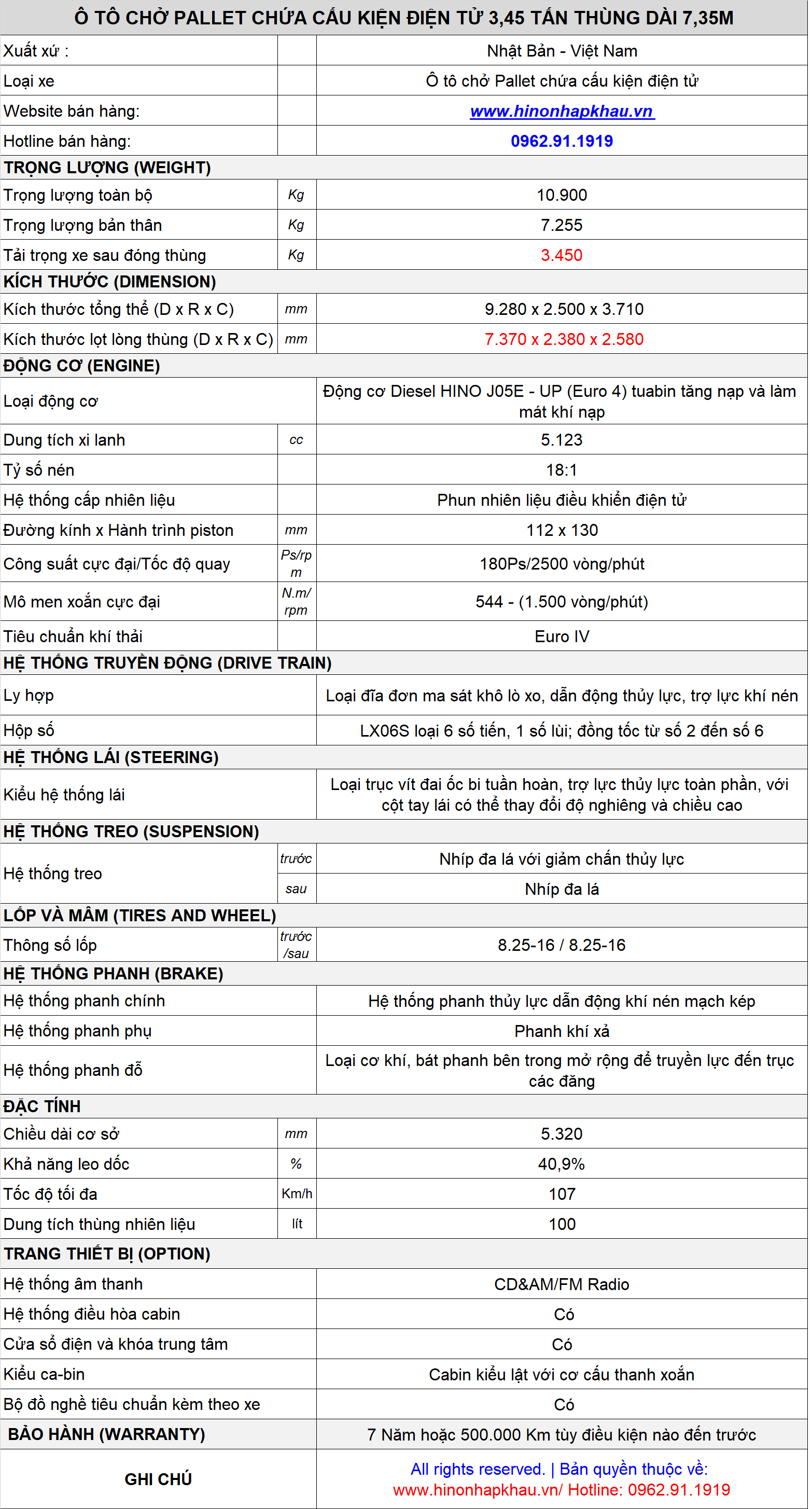 * THÔNG SỐ ĐẶC TÍNH KỸ THUẬT XE TẢI THÙNG CHỞ PALLET CHỨA CẤU KIỆN ĐIỆN TỬ 3 TẤN RƯỠI HINO 500 FC9JNTC :