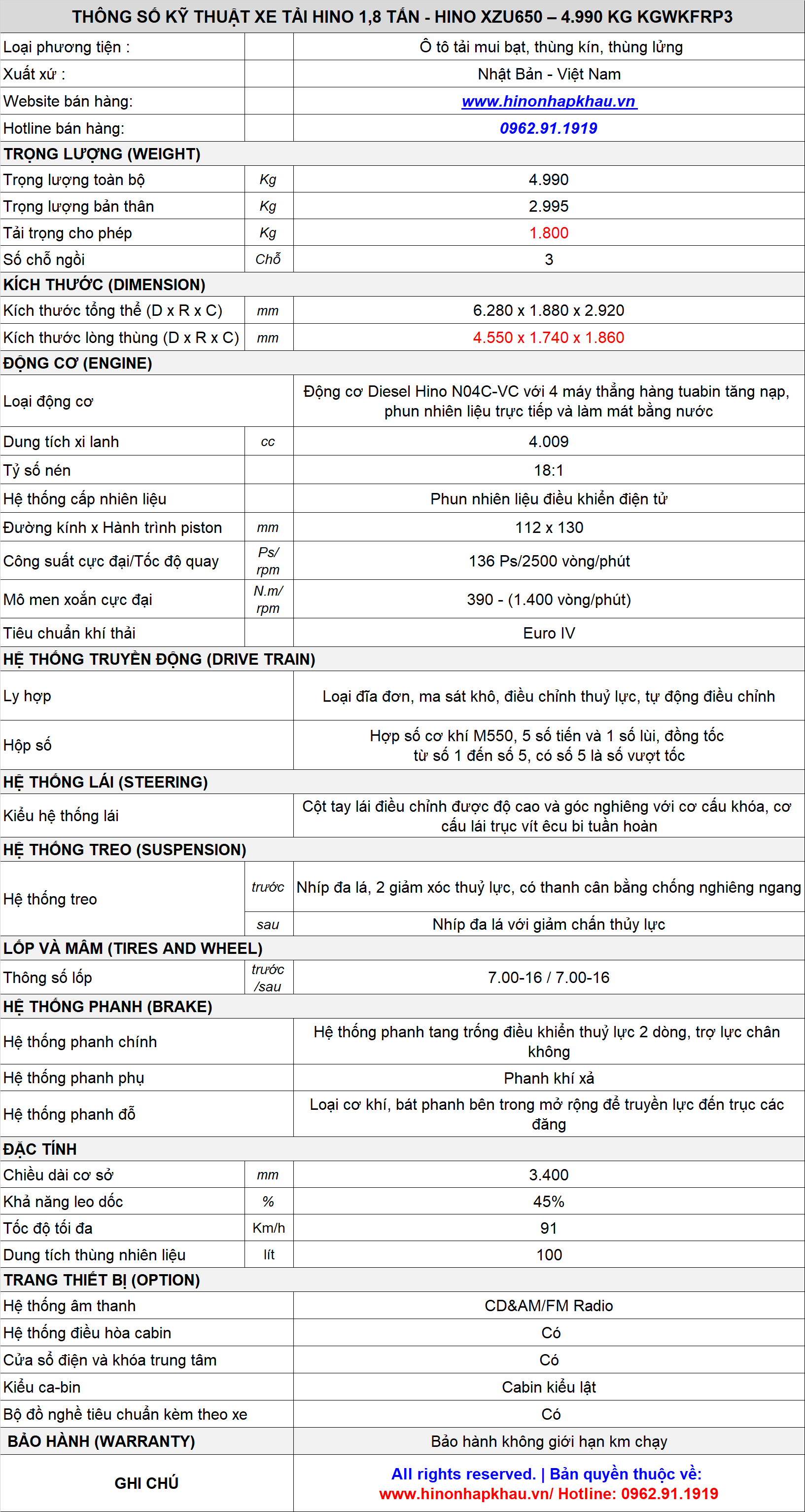 * THÔNG SỐ KỸ THUẬT XE TẢI THÙNG KÍN 1,8 TẤN HINO XZU650L-WBMMN3 THÙNG DÀI 4.55M :