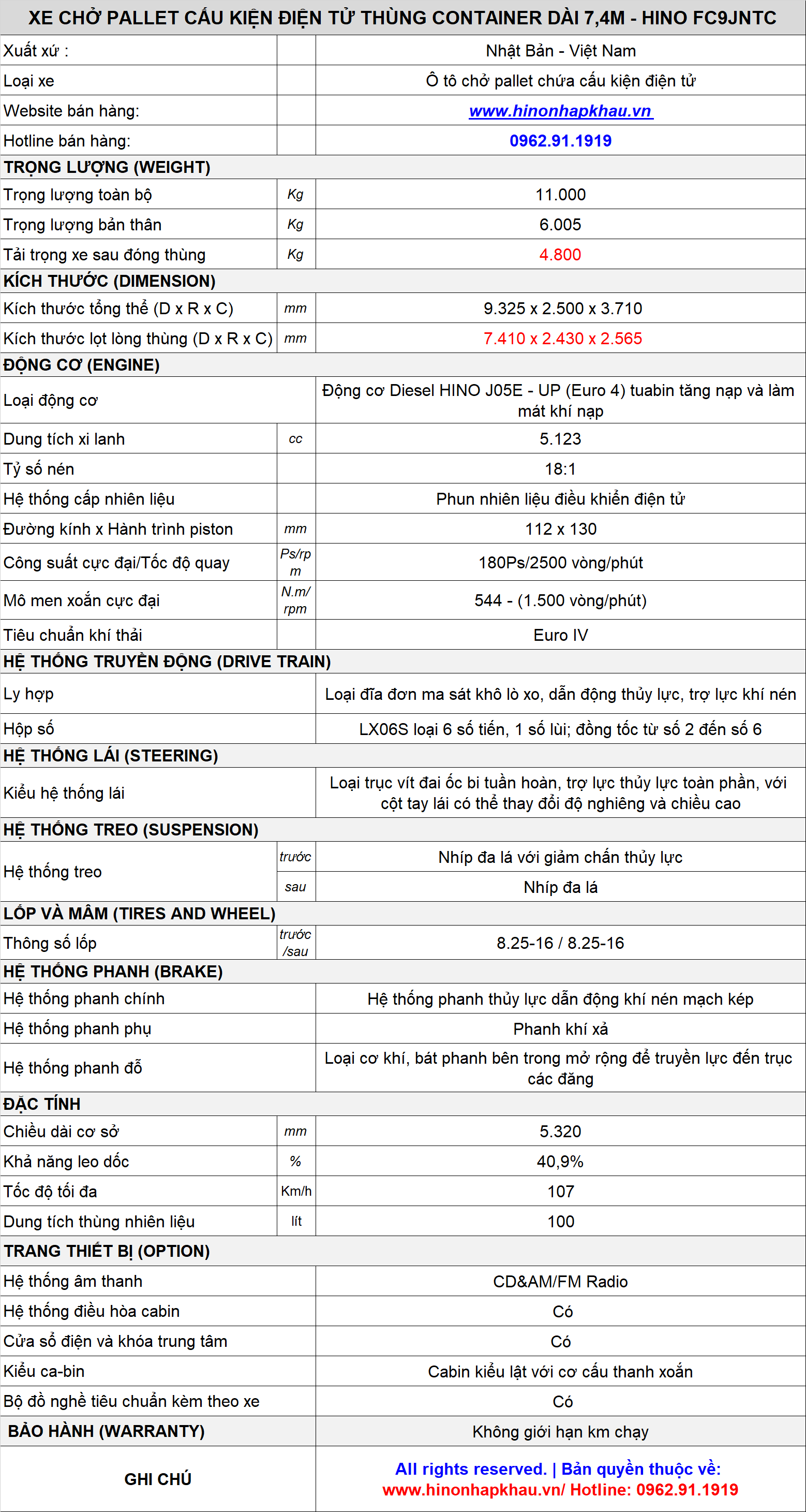 * THÔNG SỐ KỸ THUẬT XE TẢI THÙNG KÍN CONTAINER PALLET 6 TẤN HINO FC9JNTC ĐỜI 2021 - 2022: