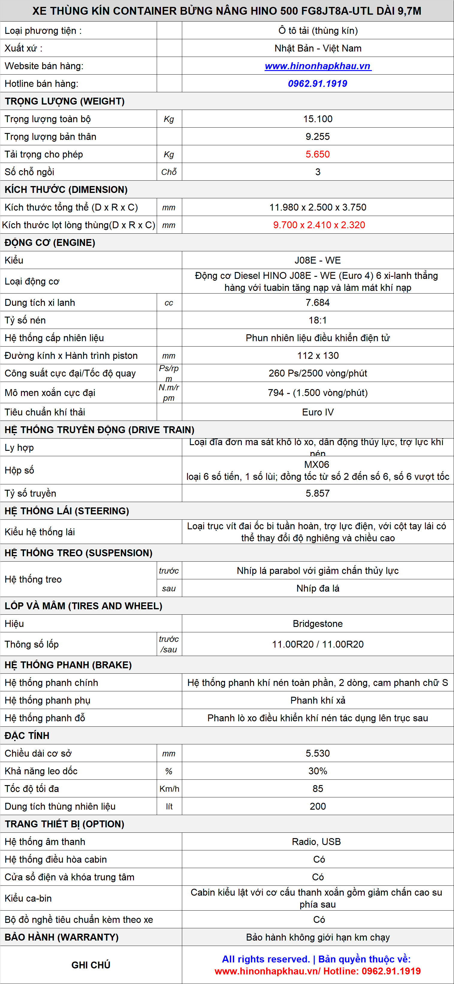 * ĐẶC TÍNH KỸ THUẬT XE TẢI THÙNG KÍN CONTAINER DÀI 9,7M LẮP BỬNG NÂNG HẠ HINO FG8JT8A-UTL EURO 5: