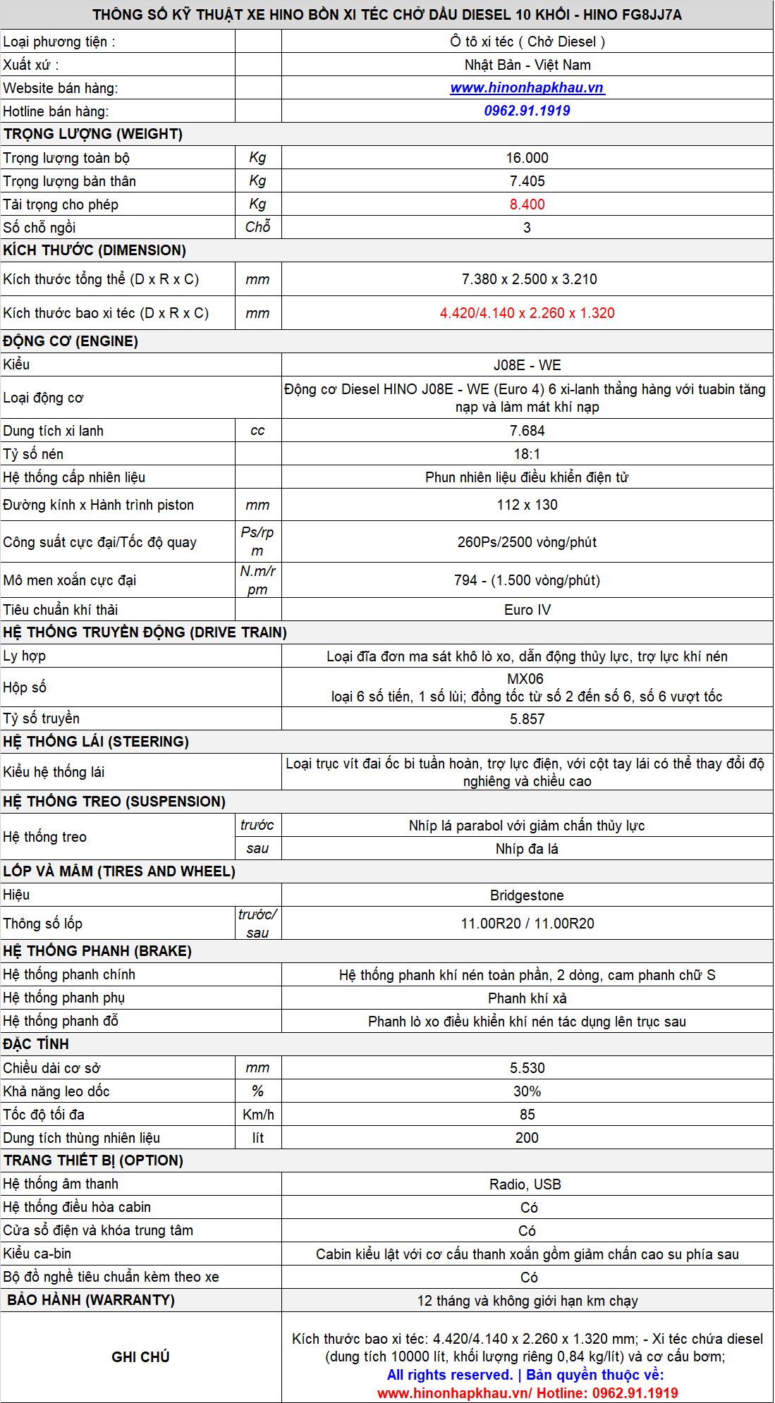 Xe téc chở Diesel 10 khối Hino FG Euro 4 - Xe bồn téc chở dầu Diesel 10m3 Hino FG8JJ7A :