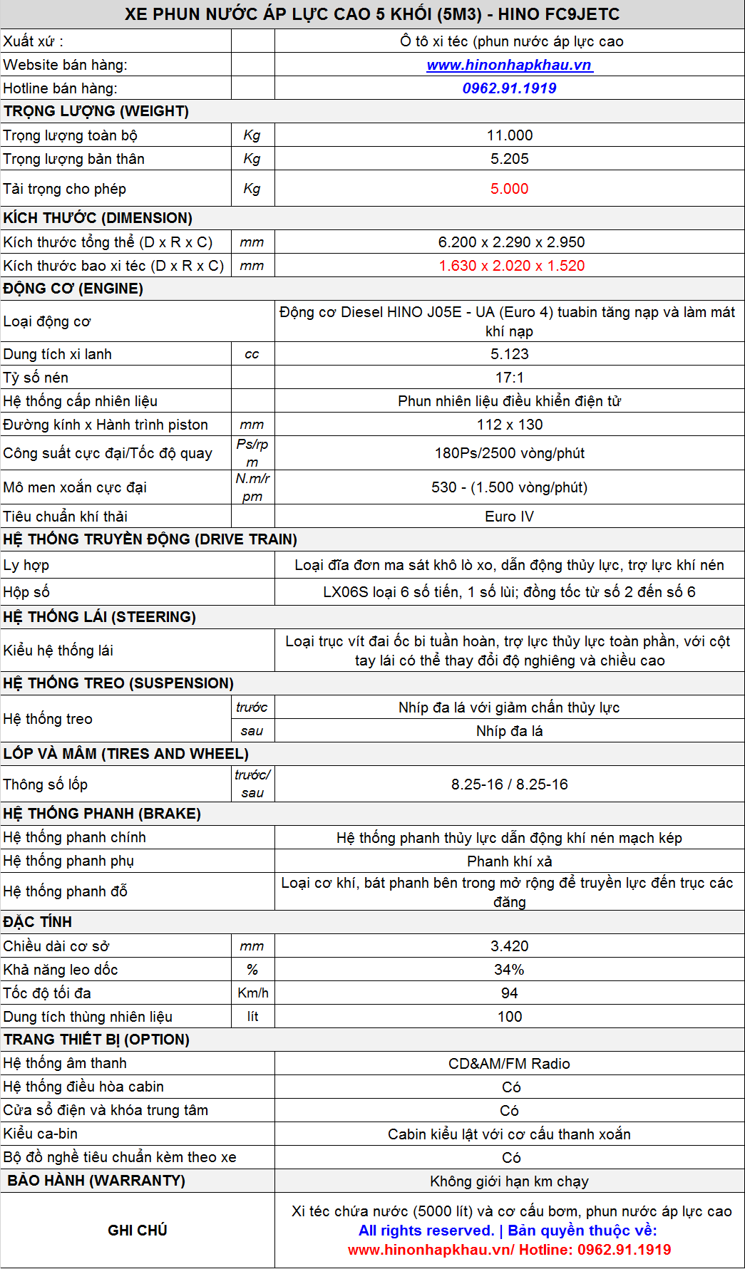 * THÔNG SỐ KỸ THUẬT Ô TÔ XI TÉC PHUN NƯỚC ÁP LỰC CAO 5 KHỐI (5M3) HINO FC9JETC EURO 4: