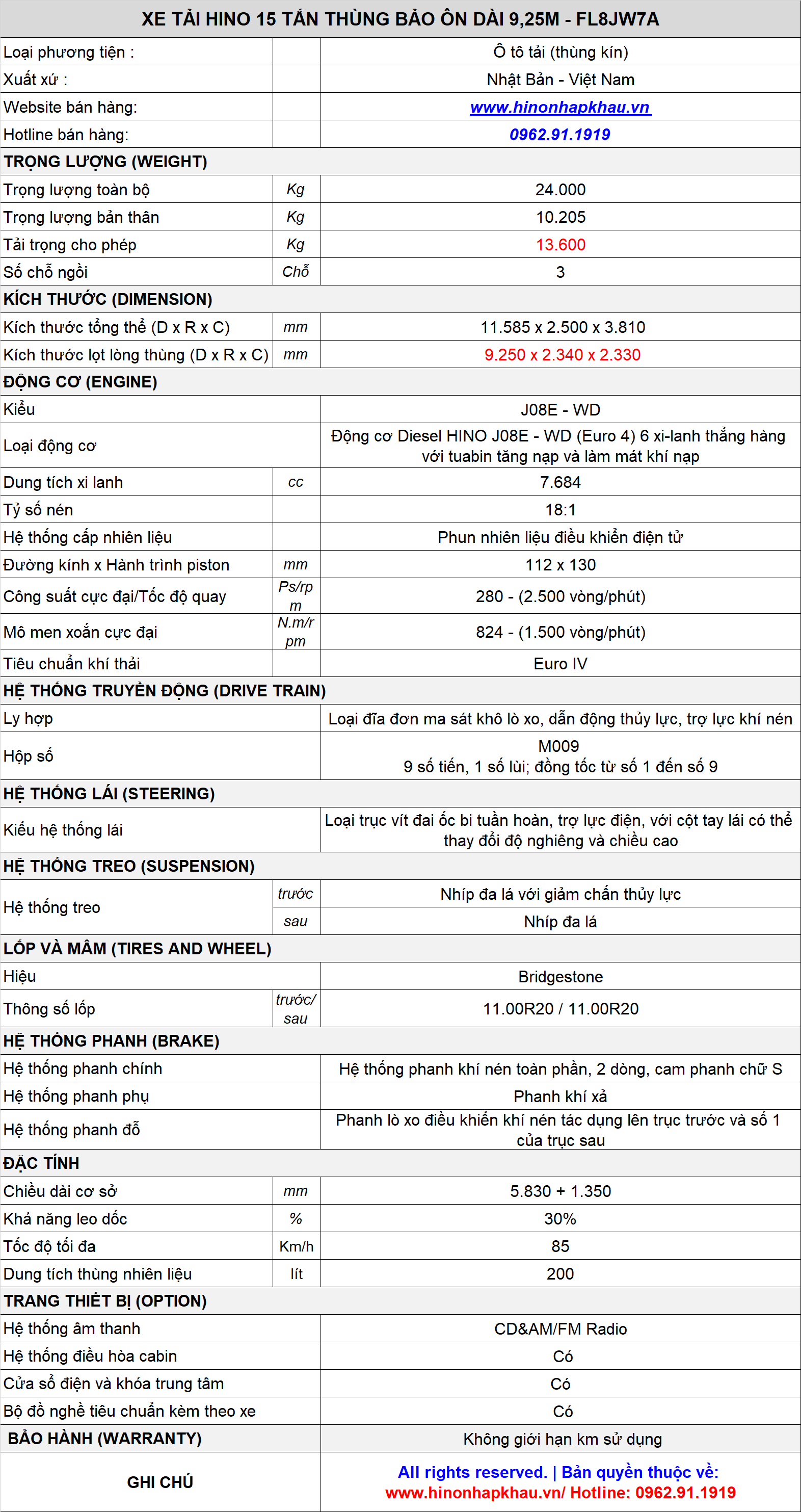 * ĐẶC TÍNH KỸ THUẬT XE TẢI HINO 15 TẤN THÙNG BẢO ÔN COMPOSITE ĐỜI 2024 - 2025 MỚI NHẤT: