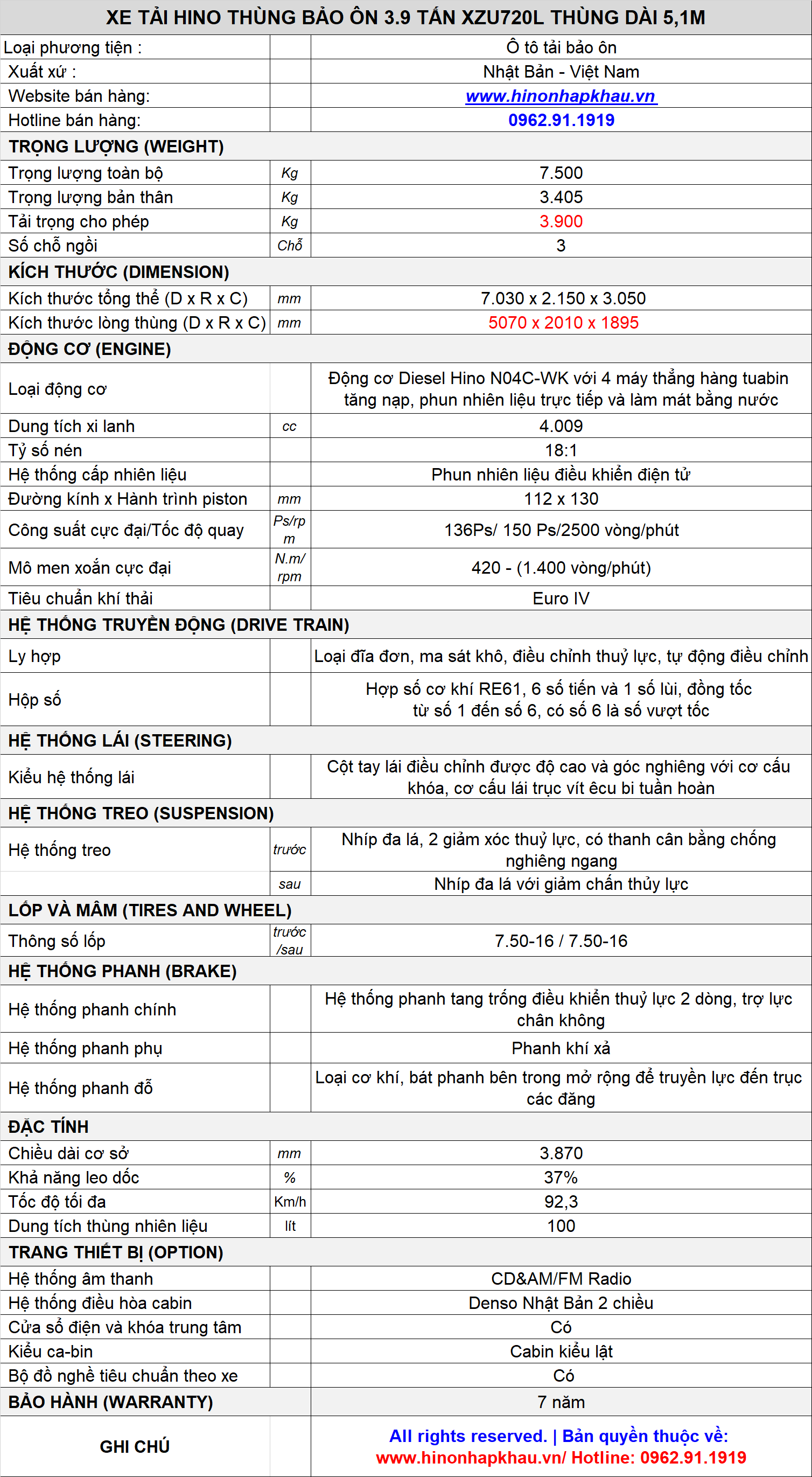 BÁO GIÁ XE TẢI THÙNG BẢO ÔN 3.9 TẤN HINO 300 XZU720L-WKFRP3 THÙNG DÀI 5,1M PHIÊN BẢN NĂM 2023 - 2024 MỚI NHẤT