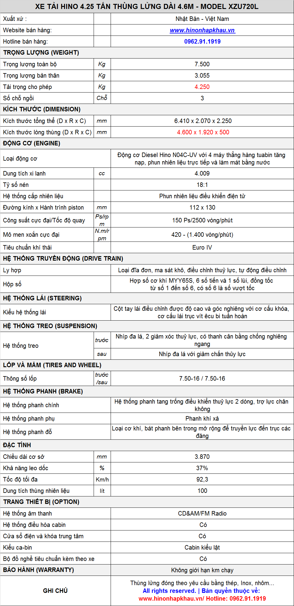 GIỚI THIỆU XE THÙNG LỬNG 4.25 TẤN HINO XZU720L THÙNG LỬNG DÀI 4.6M :