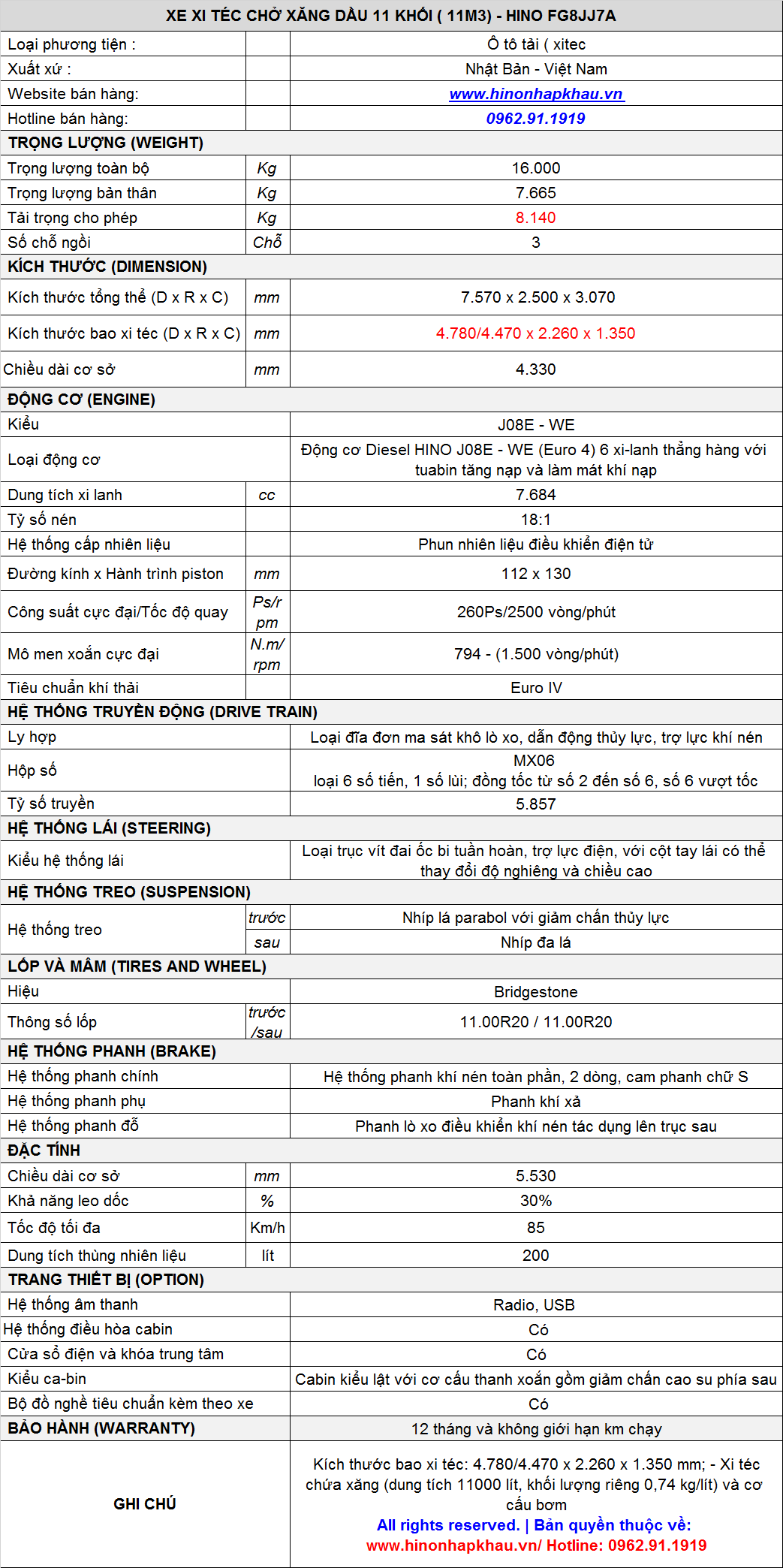 * THÔNG SỐ KỸ THUẬT XE XI TÉC CHỞ XĂNG DẦU 11 KHỐI HINO FG8JJ8A ĐỜI NĂM 2024 - 2025: