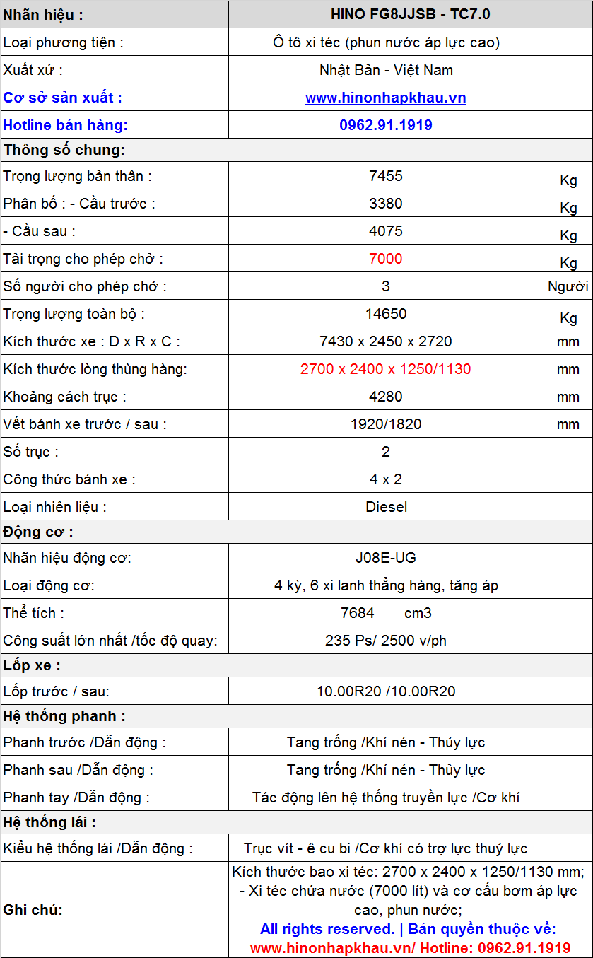 * Thông số kỹ thuật xe Hino FG phun nước áp lực cao 7 khối: