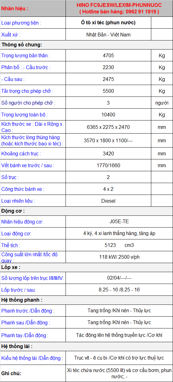 * Thông số kỹ thuật xe Xi téc phun nước – Hino FC9JESW xi téc chứa 5500 lít: