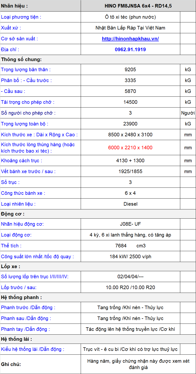 * Thông số kỹ thuật xe xi téc Hino 3 chân tưới nước rửa đường 14,5 khối: